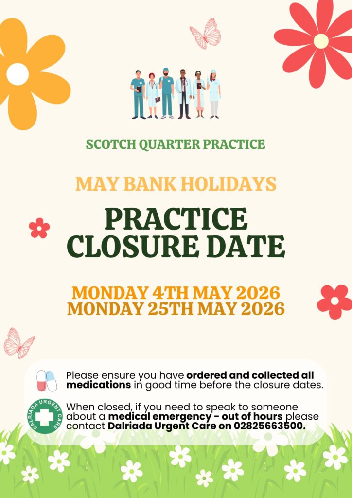 Please ensure you have ordered and collected all medications in good time before the closure date. When closed, if you need to speak to someone about a medical emergency – out of hours please contact Dalriada Urgent Care on:
